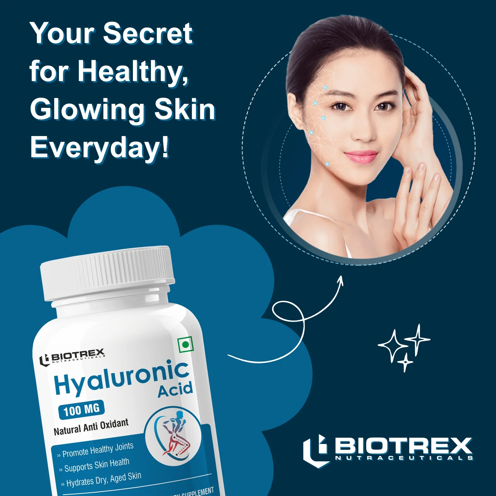 Biotrex Hyaluronic Acid 100mg Capsules offer a range of potential benefits due to their content of hyaluronic acid, a natural compound with diverse roles in the body. Here are some commonly reported benefits of these capsules: